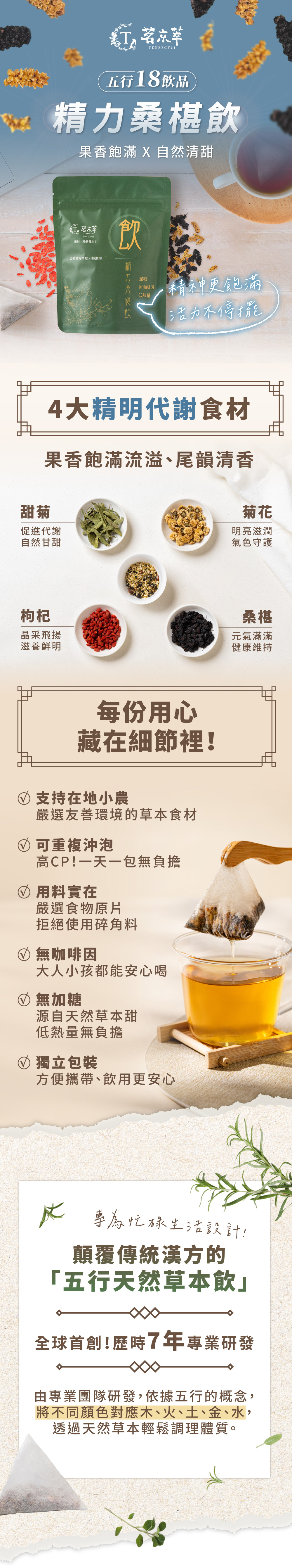 桑椹果與枸杞甜韻共同滋養,果實香氣透過熱萃而飽滿流溢,輔以菊花香氣作結
