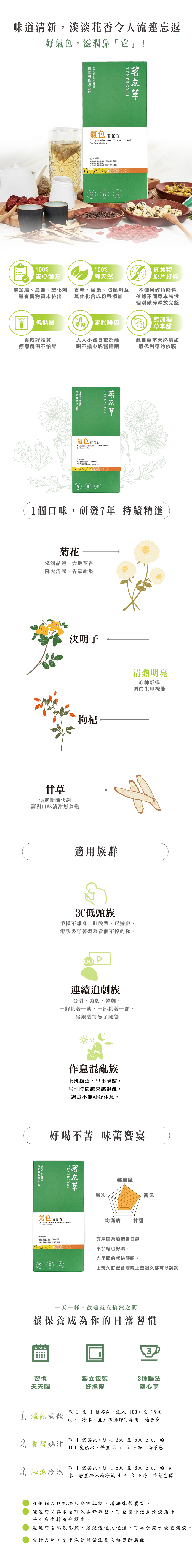 | 氣色菊花香 | 白杭菊、黃油菊、決明子、枸杞、紅棗、甘草(5克/入) |
