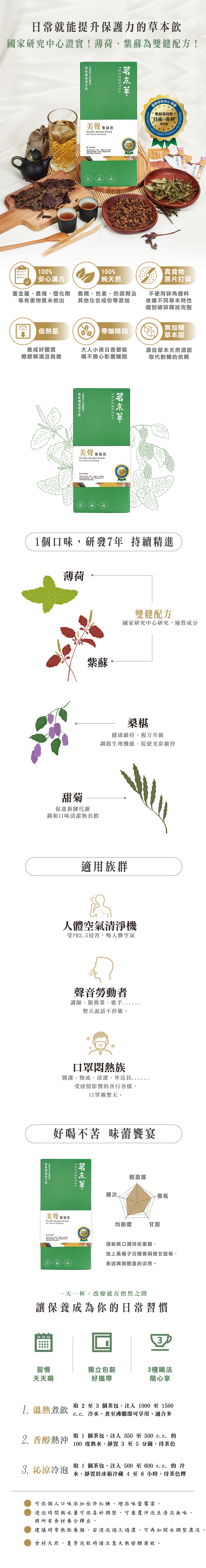 | 美聲紫蘇飲 | 紫蘇、桑椹子、薄荷、甜菊(5克/入) |